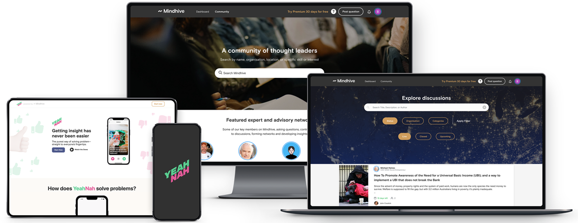 Multiple electronic devices displaying the Mindhive platform with studies, discussions, and a community page.